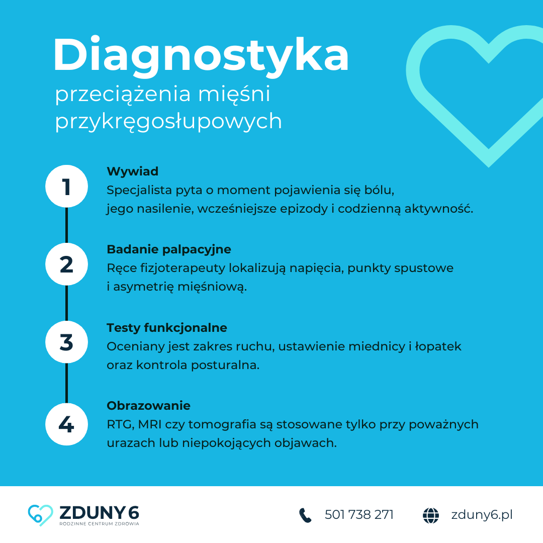 - Punktów spustowych – miejsc, które po naciśnięciu wywołują ból promieniujący (np. do pośladka, barku, uda).