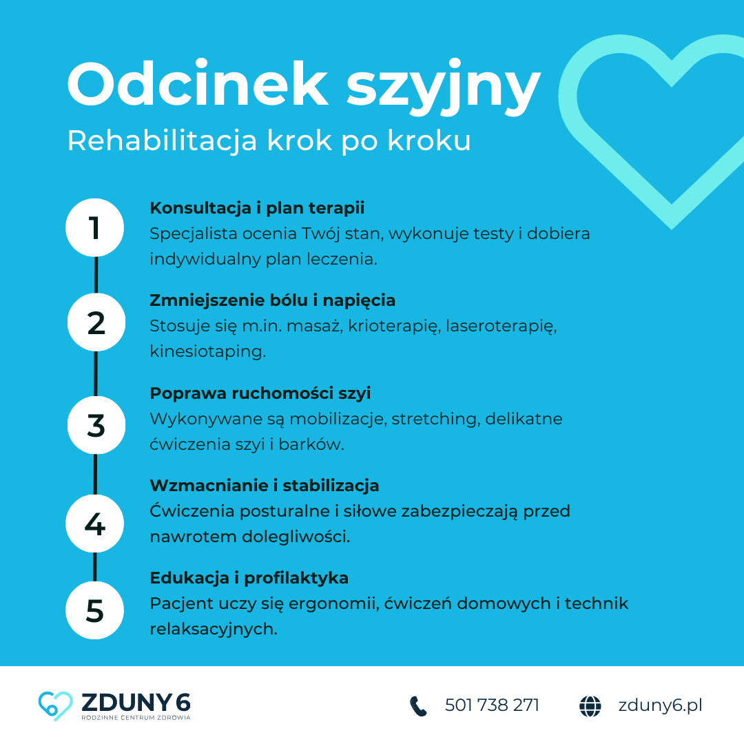 Rehabilitacja kręgosłupa szyjnego to skuteczna i bezpieczna droga do pozbycia się bólu, odzyskania pełnej ruchomości i poprawy jakości życia. Kluczowe są indywidualnie dobrane ćwiczenia, regularność oraz współpraca ze specjalistą. Nawet niewielkie zmiany mogą przynieść odczuwalną ulgę. Zadbaj o swoje zdrowie z naszym Rodzinnym Centrum Zdrowia w Bydgoszczy.