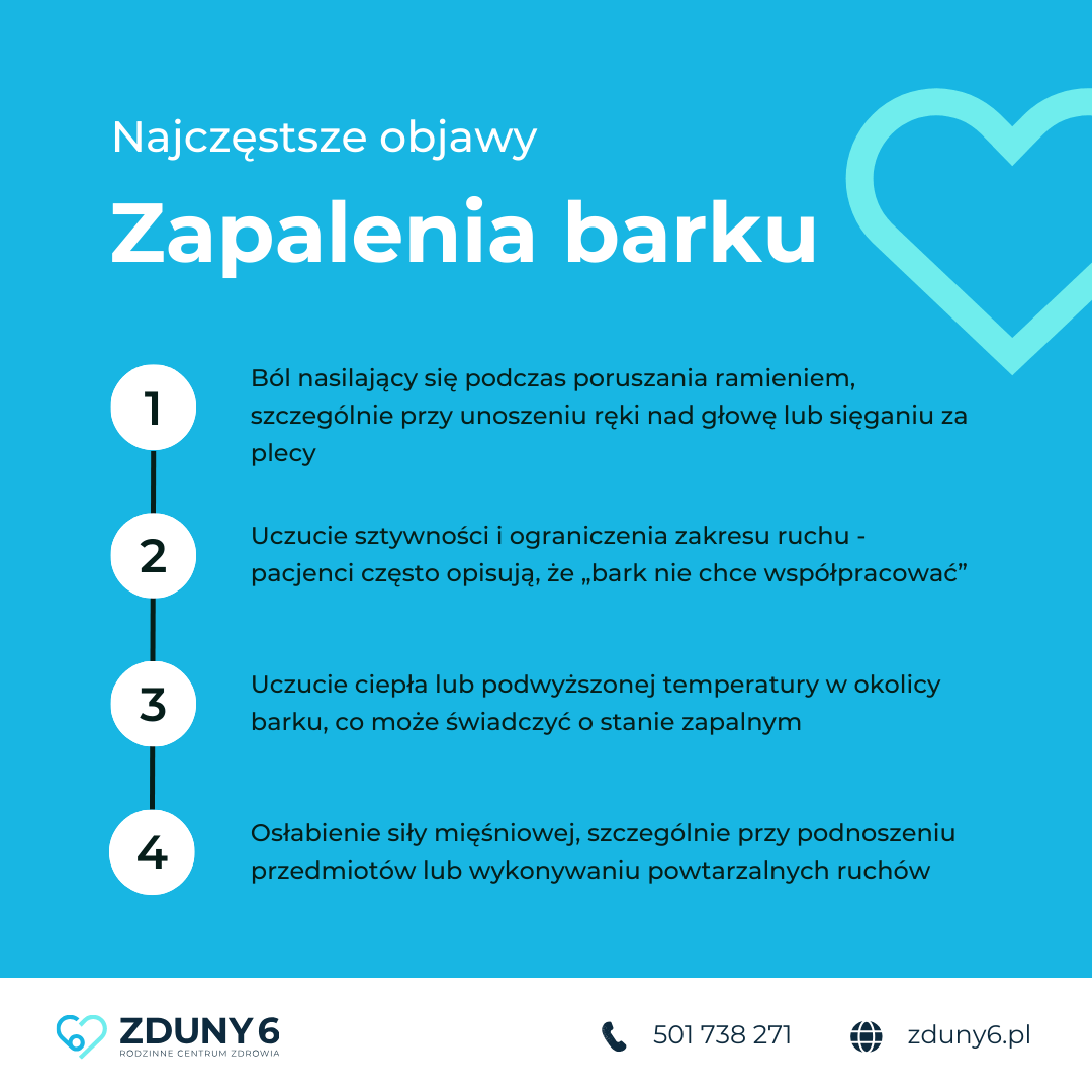 Zapalenie stawu barkowego to dolegliwość, której nie warto ignorować - szybka diagnoza i właściwe leczenie pozwalają uniknąć przewlekłego bólu i poważniejszych powikłań. Jeśli szukasz wsparcia w rehabilitacji poznaj ofertę Zduny6, gdzie znajdziesz kompleksowe wsparcie w powrocie do zdrowia.