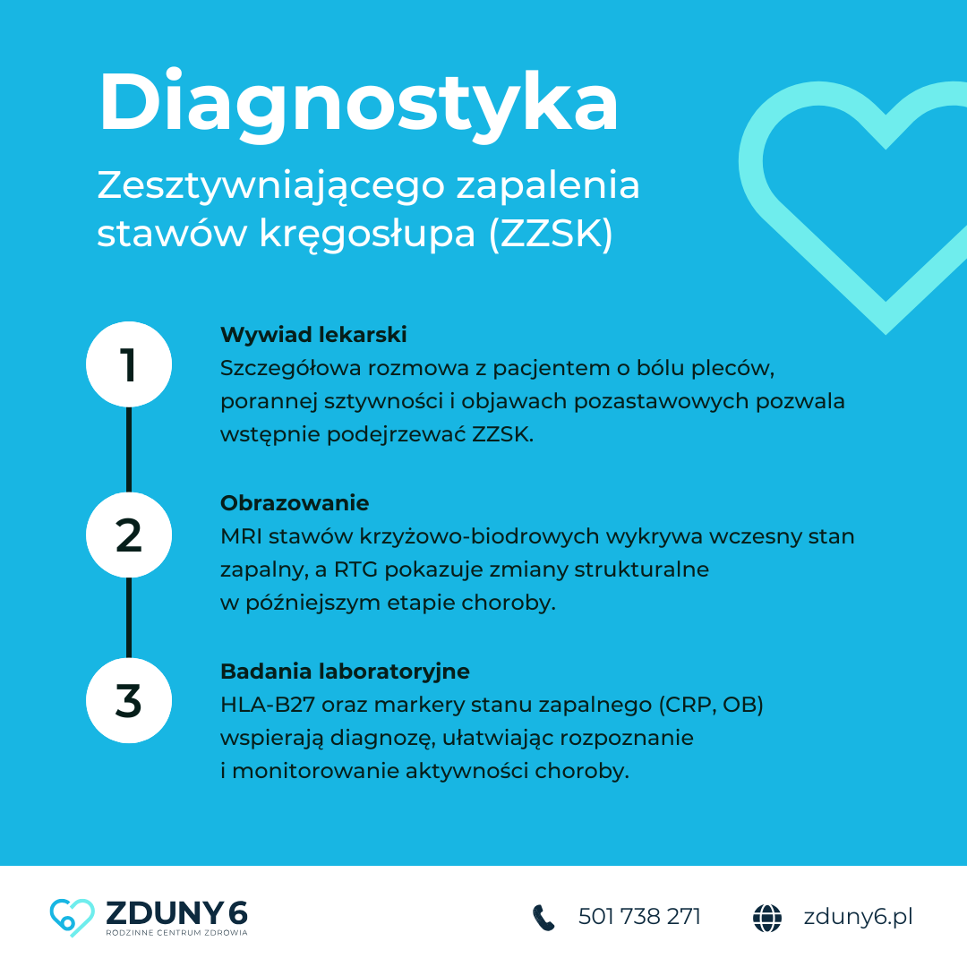 - RTG kręgosłupa i stawów krzyżowo-biodrowych – pomocne w późniejszych etapach, pokazuje tzw. „mosty kostne” i typowy obraz „kija bambusowego”.